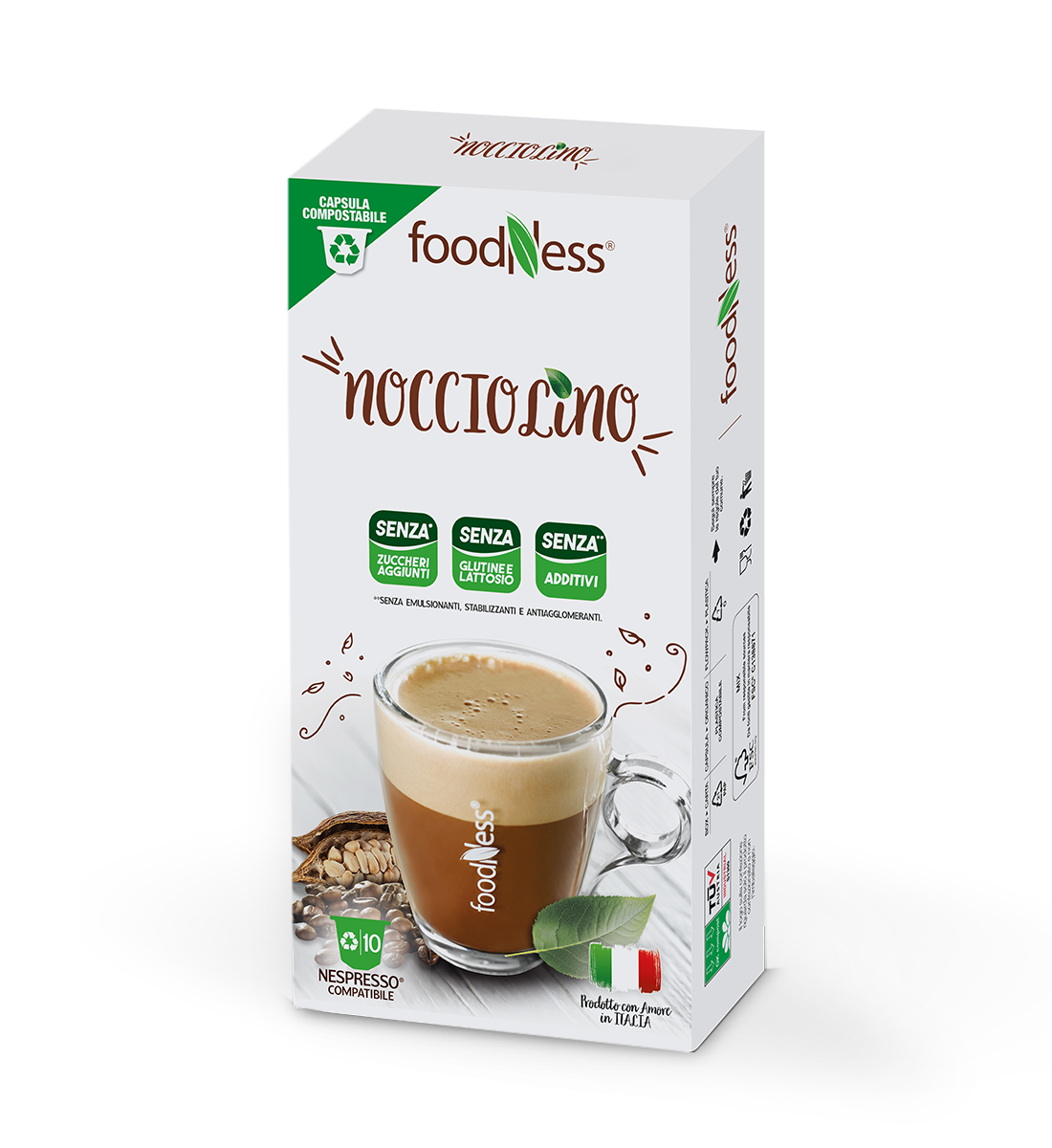 *Nespresso® e *Nescafé® *Dolce Gusto® sono marchi registrati di Societè des Produits Nestlè® SA. Foodness Spa è produttore autonomo non collegato alla Societè des Produits Nestlè® SA. La compatibilità delle capsule Foodness è funzionale all'utilizzo con macchine da caffè ad uso domestico Nespresso® - Nescafé® Dolce Gusto®.
